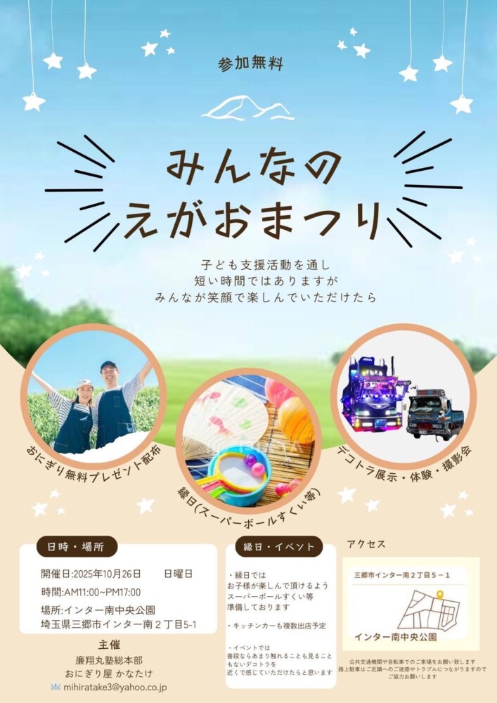 インター南中央公園で、おにぎり屋かなたけさん・廉翔丸塾総本部さん主催による『みんなのえがおまつり』が開催されるそうです。