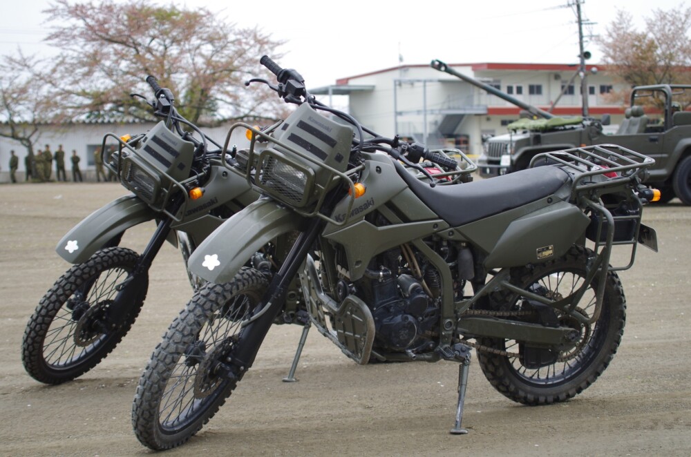バイクはカワサキのKLXですかね。自衛隊用にカスタムが施されているようで。