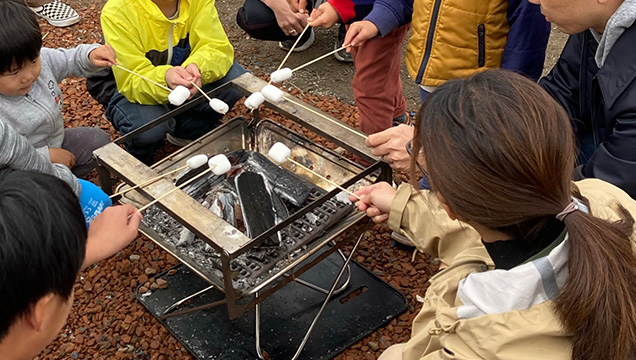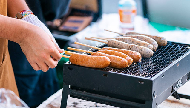 青柳庵の調理室で下処理としてお肉をカット、コーヒーを焙煎して抽出。当日はクーラーボックスで冷蔵して持参。炭でよく焼いて紙皿で提供。