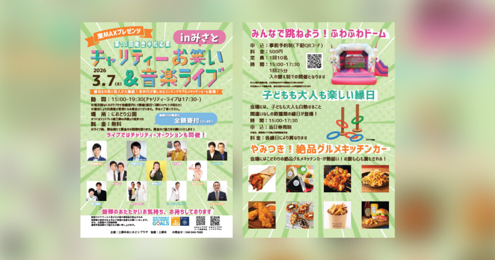 2026年3月7日(土)におどり公園で東MAXプレゼンツチャリティーお笑い&音楽ライブがあるよ!ピコ太郎とか!
